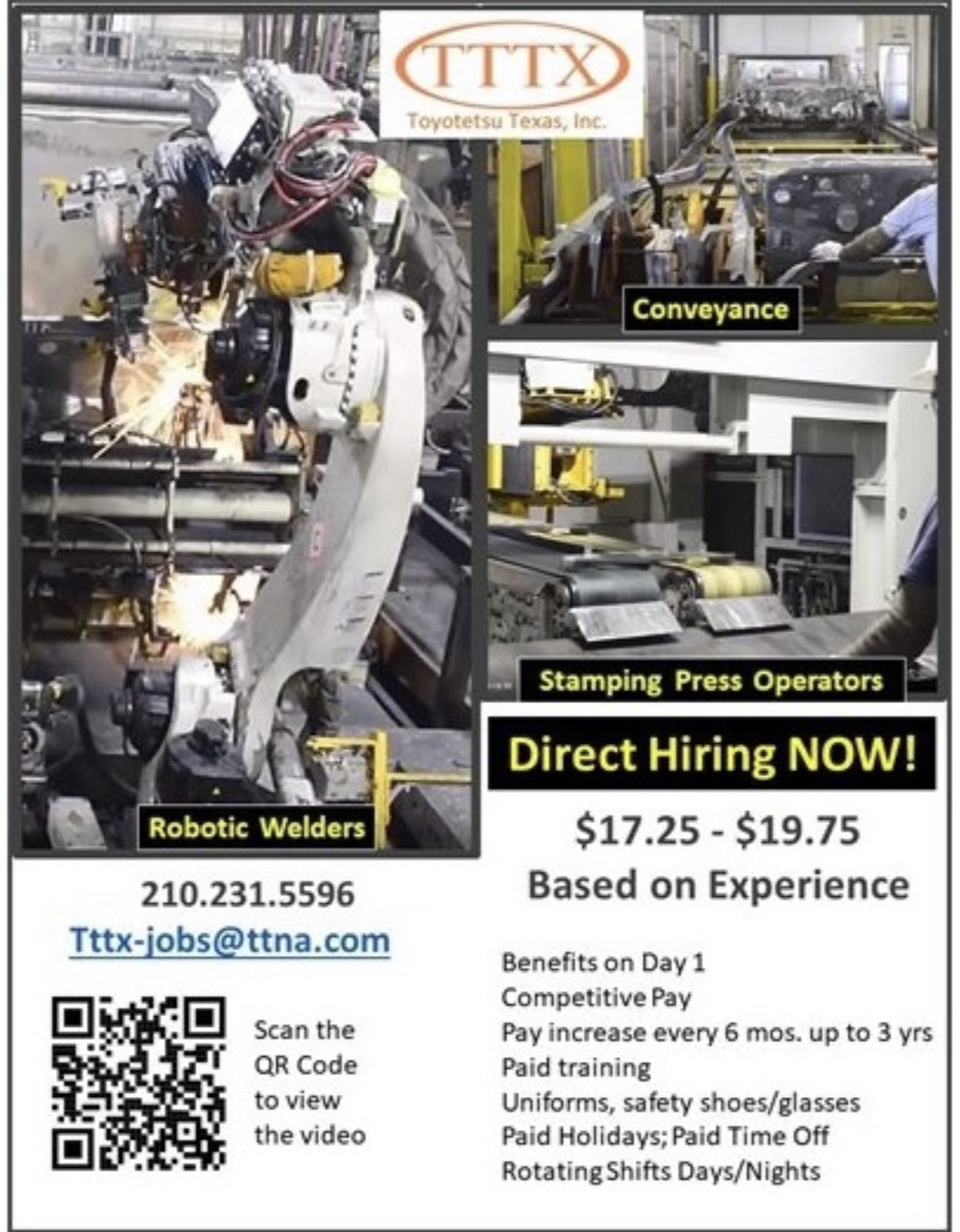 Career Services On Twitter Toyotetsu Texas Inc Is Hiring Some Benefits Include 17 25 19 75 Hour Pay Paid Holidays And Paid Time Off How To Apply 210 232 5596 Tttx Jobs Ttna Com Uiwcareersvcs Hireacardinal Texas